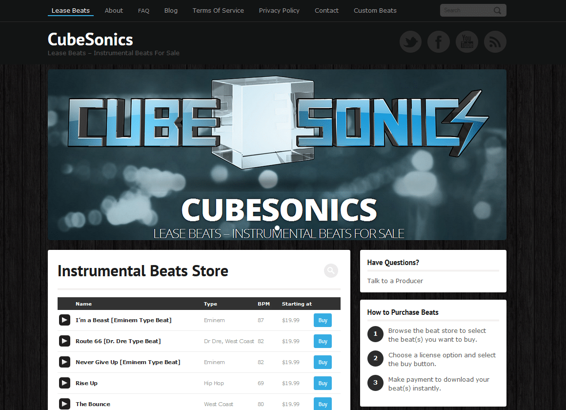 CubeSonics Features Include: Website Package, Beat Player Integration, Shopping Cart, Website Training, Content Added by ClientFacebookTwitterLinkedIn